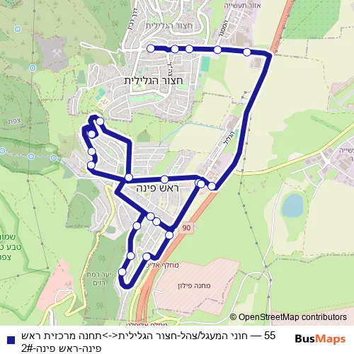 The first stop of the 55 bus route is Honi Hame'agel/Tsahal and the last stop is Rosh Pina Central Station. 55 (חוני המעגל/צהל-חצור הגלילית<->תחנה מרכזית ראש פינה-ראש פינה-2#) is operational during everyday.