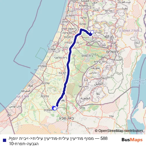 The first stop of the 588 bus route is Modi'in Ilit Terminal and the last stop is Beit Yosef/Hagiva. 588 (מסוף מודיעין עילית-מודיעין עילית<->בית יוסף/הגבעה-תפרח-10) is operational during everyday.