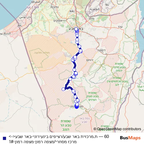 The first stop of the 60 bus route is Be'er Sheva Central Station/Interurban Platforms and the last stop is Commercial Center/Mitspe Ramon. 60 (ת.מרכזית באר שבע/רציפים בינעירוני-באר שבע<->מרכז מסחרי/מצפה רמון-מצפה רמון-1#) is operational during everyday.