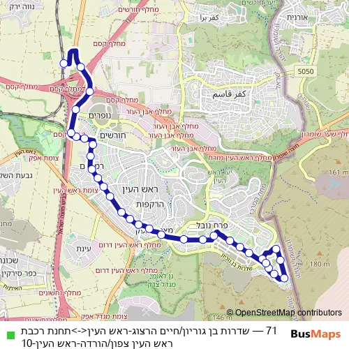 The first stop of the 71 bus route is Ben Gurion Blvd and the last stop is Rosh Haayin Train Station North/Disembarking. 71 (שדרות בן גוריון/חיים הרצוג-ראש העין<->תחנת רכבת ראש העין צפון/הורדה-ראש העין-10) is operational during everyday.