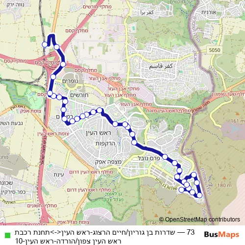 The first stop of the 73 bus route is Ben Gurion Blvd and the last stop is Rosh Haayin Train Station North/Disembarking. 73 (שדרות בן גוריון/חיים הרצוג-ראש העין<->תחנת רכבת ראש העין צפון/הורדה-ראש העין-10) is operational during everyday.