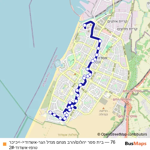 The first stop of the 76 bus route is Yahalom School/Harav Menahem Mendel Hager and the last stop is Topaz Square. 76 (בית ספר יהלום/הרב מנחם מנדל הגר-אשדוד<->כיכר טופז-אשדוד-2#) is operational during everyday.