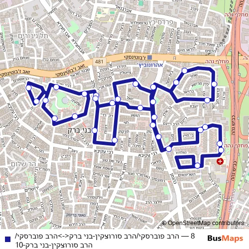 The first stop of the 8 bus route is Harav Povarsky/Harav Sorotzkin and the last stop is Harav Povarsky/Harav Sorotzkin. 8 (הרב פוברסקי/הרב סורוצקין-בני ברק<->הרב פוברסקי/הרב סורוצקין-בני ברק-10) is operational during everyday.