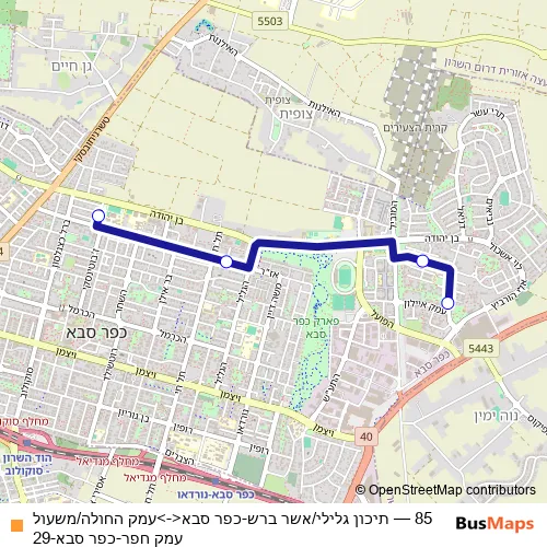 The first stop of the 85 bus route is Galili High School/Asher Barash and the last stop is Emek Hahula/Emek Hefer Alley. 85 (תיכון גלילי/אשר ברש-כפר סבא<->עמק החולה/משעול עמק חפר-כפר סבא-29) is operational during everyday.