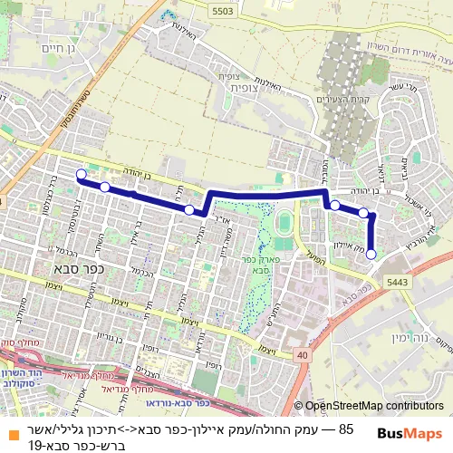 The first stop of the 85 bus route is Emek Hahula/Emek Ayalon and the last stop is Galili High School/Asher Barash. 85 (עמק החולה/עמק איילון-כפר סבא<->תיכון גלילי/אשר ברש-כפר סבא-19) is operational during everyday.