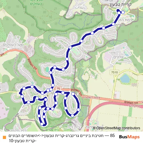 The first stop of the 85 bus route is Greenberg Middle School and the last stop is השומרים הבונים. 85 (חטיבת ביניים גרינברג-קרית טבעון<->השומרים הבונים-קרית טבעון-10) is operational during everyday.