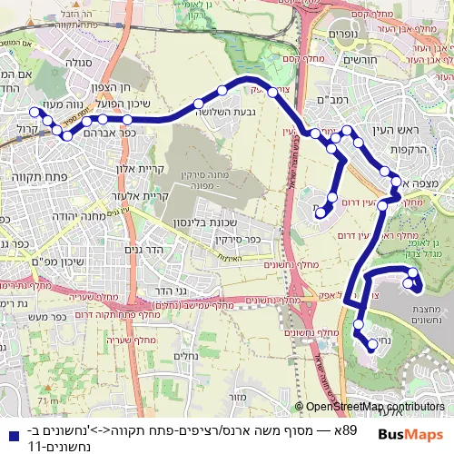 The first stop of the 89א bus route is Moshe Arens Terminal/Platforms and the last stop is Nahshonim B. 89א (מסוף משה ארנס/רציפים-פתח תקווה<->'נחשונים ב-נחשונים-11) is operational during everyday.