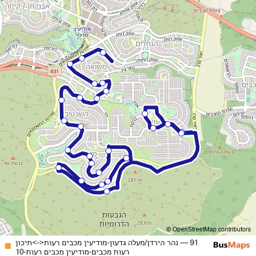 The first stop of the 91 bus route is Mevo Re'ut/Yefe Nof and the last stop is Hayarden River/Ma'ale Amiaz. 91 (נהר הירדן/מעלה גדעון-מודיעין מכבים רעות<->תיכון רעות מכבים-מודיעין מכבים רעות-10) is operational during everyday.