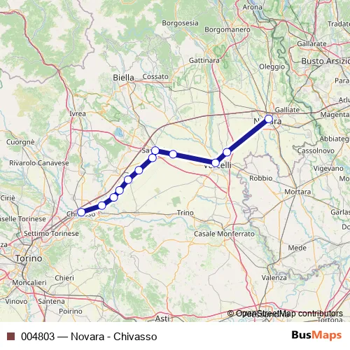 The first stop of the 004803 rail route is Novara F.S. and the last stop is Chivasso F.S.. 004803 (Novara - Chivasso) is operational during everyday.