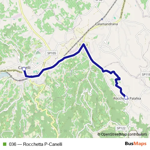 The first stop of the 036 bus route is Rocchetta Palafea and the last stop is Canelli - Paese. 036 (Rocchetta P-Canelli) is operational during everyday.