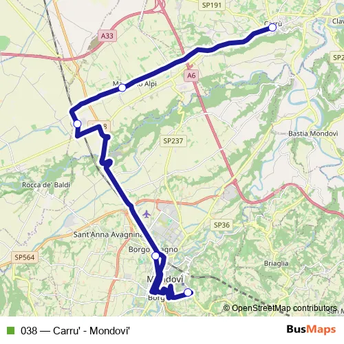 The first stop of the 038 bus route is Carru' - Piazza Mercato - Movicentro and the last stop is Mondovi' - Stazione Ferroviaria. 038 (Carru' - Mondovi') is operational during everyday.