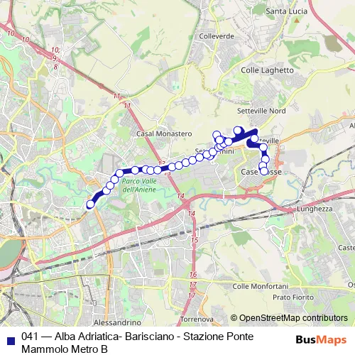 The first stop of the 041 bus route is Stazione Ponte Mammolo Metro B and the last stop is Alba Adriatica/Barisciano. 041 (Alba Adriatica- Barisciano - Stazione Ponte Mammolo Metro B) is operational during everyday.