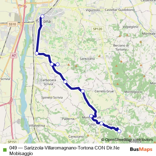 The first stop of the 049 bus route is Tortona - Autostazione and the last stop is Costa Vescovato Frazione Sarizzola. 049 (Sarizzola-Villaromagnano-Tortona CON Dir.Ne Mobisaggio) is operational during everyday.