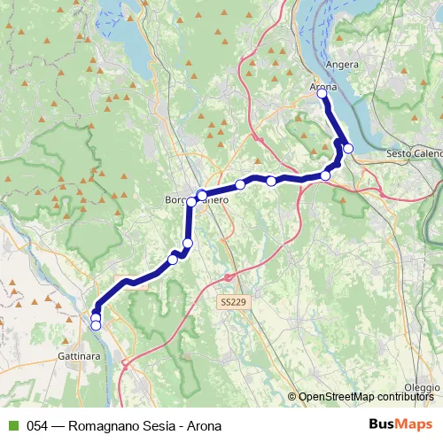 The first stop of the 054 bus route is Arona - Stazione Ferroviaria and the last stop is Romagnano Sesia - Stazione Ferroviaria. 054 (Romagnano Sesia - Arona) is operational during everyday.
