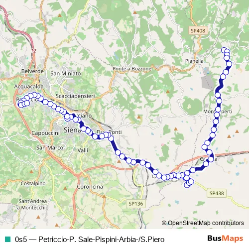 Click here to view the nearest 0s5 - Petriccio-P. Sale-Pispini-Arbia-/S.Piero bus stop.