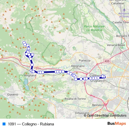 The first stop of the 1091 bus route is Fermata 13392 - Rubiana (P.Zza Roma) and the last stop is Fermata 829 - Collegno (Fermi Cap). 1091 (Collegno - Rubiana) is operational during everyday.