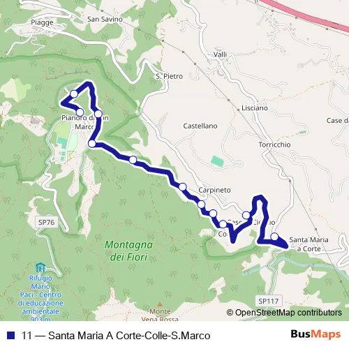 The first stop of the 11 bus route is Santa Maria A Corte and the last stop is Capolinea S. Marco. 11 (Santa Maria A Corte-Colle-S.Marco) is operational during everyday.