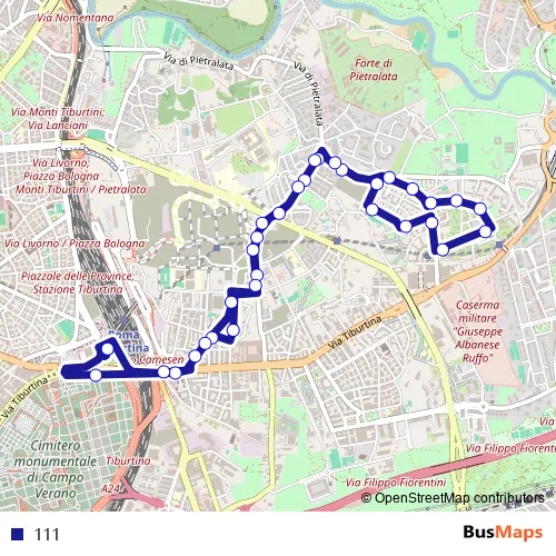 The first stop of the 111 bus route is Stazione Tiburtina Metro B and the last stop is Stazione Tiburtina Metro B. 111 is operational during everyday.