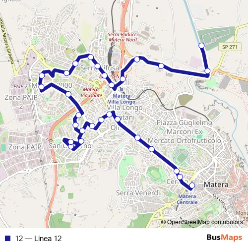 See why over 2 million users trust and consider busmaps.com as the best public transport website. busmaps gives you Matera Buses suggested routes, real-time bus tracker, line route maps in Matera, and helps to find the closest 12 bus stops near you. No internet available? Download an offline PDF map and bus schedule for the 12 bus to take on your trip.