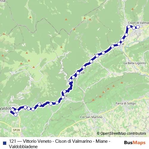 The first stop of the 121 bus route is Valdobbiadene Autostazione and the last stop is Cison VIA Italia. 121 (Vittorio Veneto - Cison di Valmarino - Miane - Valdobbiadene) is operational during everyday.