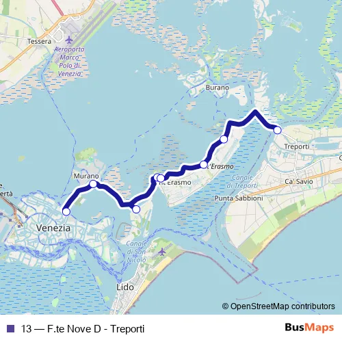 The first stop of the 13 ferry route is F.te Nove D and the last stop is Treporti. 13 (F.te Nove D - Treporti) is operational during everyday.