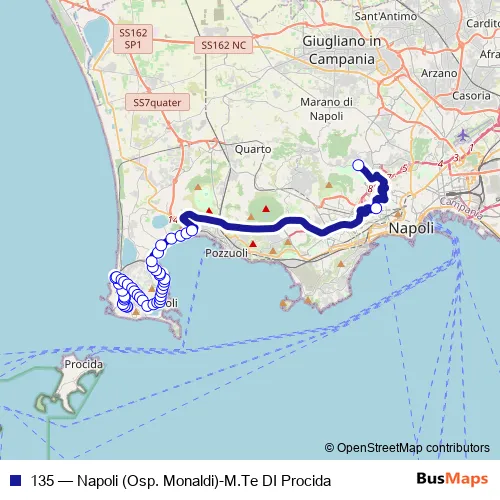 The first stop of the 135 bus route is Monte di Procida - Comune and the last stop is Napoli - Osp. Monaldi. 135 (Napoli (Osp. Monaldi)-M.Te DI Procida) is operational during everyday.