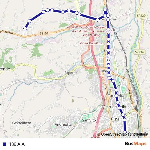 The first stop of the 136 A A bus route is Autostazione Cosenza - Cosenza and the last stop is
