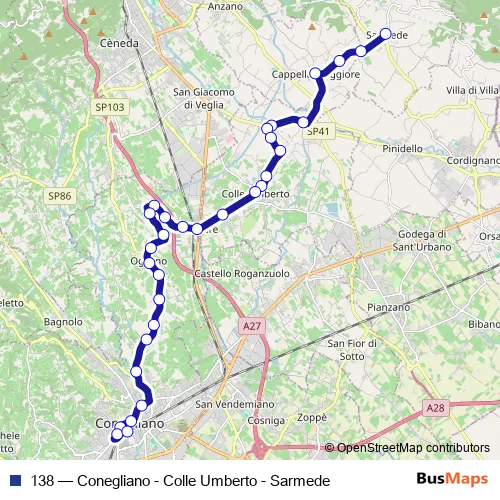 The first stop of the 138 bus route is Sarmede Piazza Chiesa and the last stop is Conegliano Aut.. 138 (Conegliano - Colle Umberto - Sarmede) is operational during everyday.
