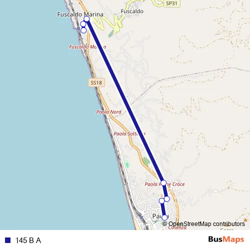 The first stop of the 145 B A bus route is Via Maggiore Alfonso Vaccari, 147 - Fuscaldo and the last stop is Piazza IV Novembre - Paola. 145 B A is operational during everyday.
