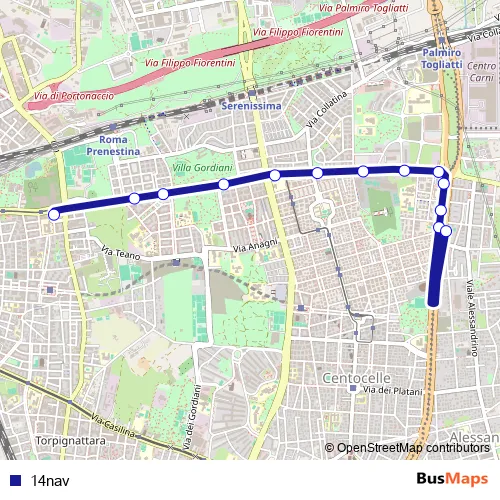 The first stop of the 14nav bus route is L.Go Preneste and the last stop is Togliatti/Molfetta. 14nav is operational during everyday.