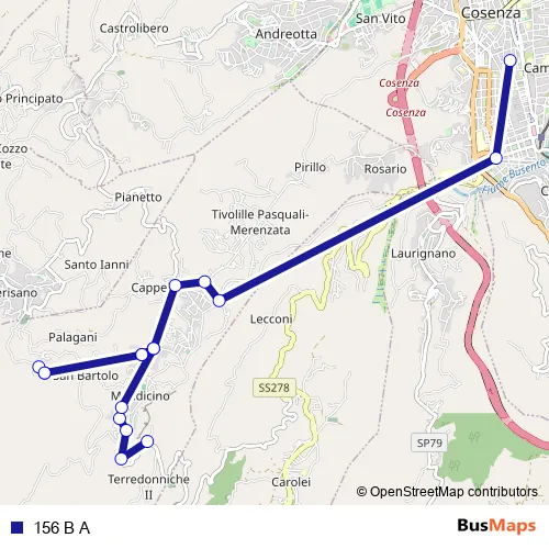 The first stop of the 156 B A bus route is Strada Provinciale 81 - Mendicino and the last stop is Autostazione Cosenza - Cosenza. 156 B A is operational during everyday.