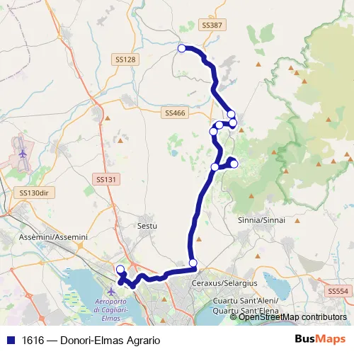 The first stop of the 1616 bus route is Fermata di Ist. Agrario Cortile A (Elmas) and the last stop is Fermata di Donori. 1616 (Donori-Elmas Agrario) is operational during everyday.