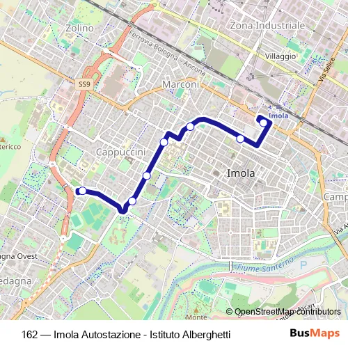 The first stop of the 162 bus route is SAN Benedetto and the last stop is Imola Autostazione. 162 (Imola Autostazione - Istituto Alberghetti) is operational during everyday.