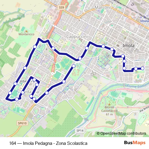 The first stop of the 164 bus route is Colombarina and the last stop is Sante Zennaro. 164 (Imola Pedagna - Zona Scolastica) is operational during everyday.