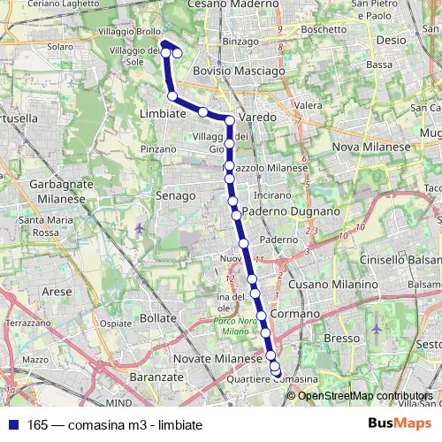 The first stop of the 165 bus route is limbiate (ospedale) and the last stop is comasina m3. 165 (comasina m3 - limbiate) is operational during on weekends.
