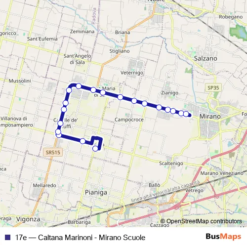 See why over 2 million users trust and consider busmaps.com as the best public transport website. busmaps gives you Santa Maria di Sala Buses suggested routes, real-time bus tracker, line route maps in Santa Maria di Sala, and helps to find the closest 17e bus stops near you. No internet available? Download an offline PDF map and bus schedule for the 17e bus to take on your trip.