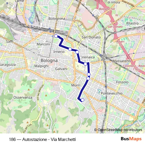 The first stop of the 186 bus route is Bologna Autostazione and the last stop is Istituto Arcangeli. 186 (Autostazione - Via Marchetti) is operational during everyday.