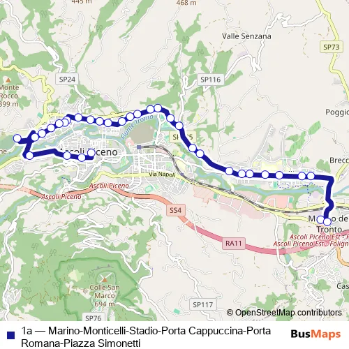 The first stop of the 1a bus route is Marino - Bivio Stazione and the last stop is Ascoli Piceno - VIA Trieste EX-Olimpia. 1a (Marino-Monticelli-Stadio-Porta Cappuccina-Porta Romana-Piazza Simonetti) is operational during everyday.