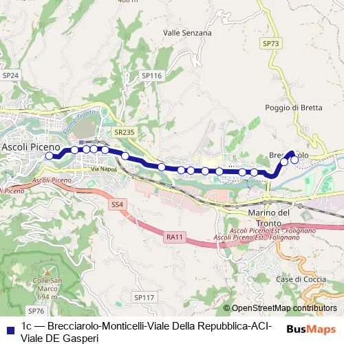 The first stop of the 1c bus route is Ascoli Piceno - V.Le DE Gasperi (Jolly) and the last stop is Brecciarolo Chiesa. 1c (Brecciarolo-Monticelli-Viale Della Repubblica-ACI-Viale DE Gasperi) is operational during everyday.