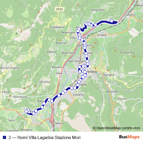 Via Don Sturzo - Via del Garda - Via G. Battisti - Via della Cooperazione - Via Terranera - Via Guglielmo Marconi - Via Roma - Via Dante Alighieri - Via del Dazio - Via Stazione - Via del Garda - Viale Caproni - Via del Garda - Via Abetone - Via Benacense - Via Padova - Via Benacense - Via Dante Alighieri - Via Camillo Benso Conte di Cavour - Via Bianca Laura Saibanti - Strada Statale 12 del Brennero - Corso Antonio Rosmini - Corso Bettini - Viale Trento - Via Lagarina - Via degli Alpini - Via Giovanni Segantini - Via Magre' - Via Giardini - Via tre Novembre - Via San Cristoforo - Via Giovanni Rossaro - Via Remo Galvagni - Via Roma