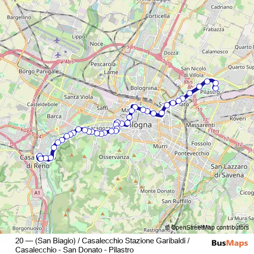 Bus 20 - (San Biagio) / Casalecchio Stazione Garibaldi / Casalecchio - San Donato - Pilastro in Bologna: Stops & Timetable