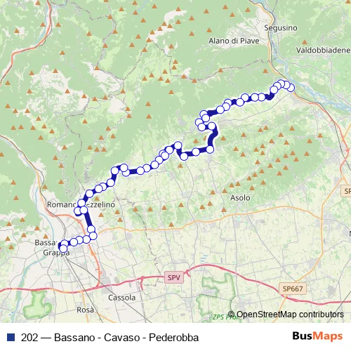 The first stop of the 202 bus route is Bivio Pederobba and the last stop is Bassano Fs. 202 (Bassano - Cavaso - Pederobba) is operational during everyday.