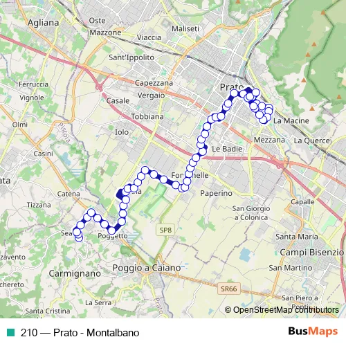 The first stop of the 210 bus route is Seano Parco Museo and the last stop is Prato Stazione Fs 1. 210 (Prato - Montalbano) is operational during everyday.