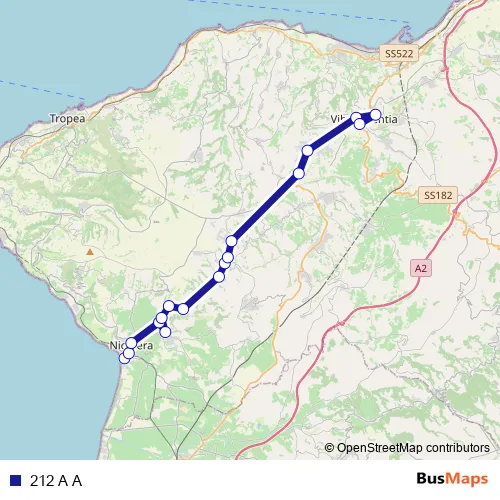 The first stop of the 212 A A bus route is Via Vittorio Emanuele, 17 - Nicotera and the last stop is Via degli Artigiani, 1 - Vibo Valentia. 212 A A is operational during everyday.