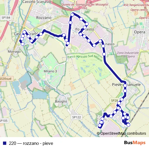 The first stop of the 220 bus route is rozzano (solidarietã ) and the last stop is pieve e. (q.re delle rose). 220 (rozzano - pieve) is operational during on weekends.