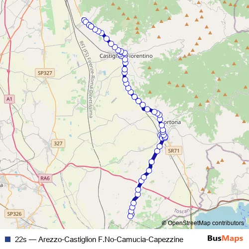 The first stop of the 22s bus route is Capezzine (Istituto Agrario) and the last stop is Rigutino Sr71 Di Fr. Planet. 22s (Arezzo-Castiglion F.No-Camucia-Capezzine) is operational during everyday.