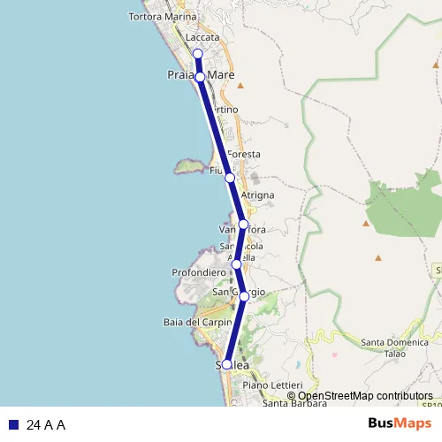 The first stop of the 24 A A bus route is Strada Senza Nome, 7 - Scalea and the last stop is Via delle Industrie - Praia a Mare. 24 A A is operational during everyday.