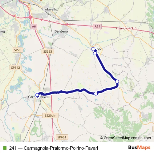 The first stop of the 241 bus route is Carmagnola - Viale Garibaldi - Scuole and the last stop is Poirino - VIA Indipendenza. 241 (Carmagnola-Pralormo-Poirino-Favari) is operational during on weekdays.