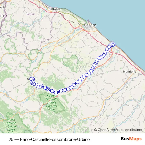 The first stop of the 25 bus route is Fano Stazione (Bus+Fs) and the last stop is Urbino Borgo Mercatale. 25 (Fano-Calcinelli-Fossombrone-Urbino) is operational during everyday.