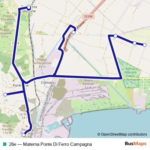 The first stop of the 26e bus route is Scuola Materna Ponte Di Ferro and the last stop is Deposito At Piombino Ovest. 26e (Materna Ponte Di Ferro Campagna) is operational during on weekdays.